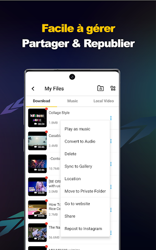Le meilleur téléchargeur de vidéo HD privé gratuit et économiseur de fichiers pour vous. Avec la vitesse de téléchargement 4x plus rapide, la sécurité absolue des fichiers, ce serait le meilleur choix de téléchargeur vidéo pour vous. Vous en avez assez des moyens compliqués et dangereux de sauvegarder du contenu/des vidéos en ligne? Essaye celui-là! Il n\a jamais été aussi facile de télécharger, d\enregistrer et de republier des vidéos à partir des médias sociaux. Super rapide et totalement gratuit! Parcourez le site Web avec le navigateur intégré, gérez les fichiers téléchargés dans l\application et partagez vos vidéos et publications préférées avec vos amis. Tout ce dont vous avez besoin est cette application Free Video Downloader. Il s\agit d\un téléchargeur haute vitesse pour votre appareil Android. Cette application de téléchargement de vidéos peut vous aider à télécharger et à enregistrer des vidéos HD à partir de votre page d\accueil de médias sociaux en un seul clic. Extrêmement rapide, sûr et 100% gratuit! Tous les formats vidéo et différentes résolutions sont pris en charge. Lisez toutes les vidéos téléchargées avec le lecteur vidéo intégré, ajustez la vitesse de lecture, le mode de répétition et convertissez facilement les vidéos en audios. C\est également un gestionnaire de fichiers pratique pour vos fichiers téléchargés. Grâce à l\interface utilisateur conviviale et à la conception claire, vous pouvez facilement gérer, republier, lire, partager et supprimer tous vos fichiers dans l\application. Enregistrez vos vidéos préférées sur votre appareil Android et profitez-en partout et à tout moment. Le meilleur outil pour sauvegarder votre contenu de médias sociaux et le partager avec vos fans et amis. Comment utiliser: 1. Appuyez sur l\icône ou saisissez l\adresse du site Web sur la page d\accueil de l\application pour ouvrir le navigateur intégré. 2. L\application détectera automatiquement les vidéos. Appuyez sur le bouton de téléchargement pour démarrer le téléchargement. 3. Lisez et gérez tous les fichiers vidéo téléchargés dans l\onglet \Fichiers\. Principales caractéristiques: * Téléchargeur rapide pour Twitter, WhatsApp, Tumblr... Stable et sûr. * Prend en charge le téléchargement multi-threading et accélère les téléchargements plusieurs fois. * Sélectionnez différentes résolutions: économisez de l\espace en choisissant une petite taille et profitez de vidéos HD en sélectionnant le mode haute définition. * Téléchargez plusieurs fichiers en même temps et téléchargez des vidéos en arrière-plan. * Navigateur intégré et gestionnaire de fichiers intégré. Mettre en pause, reprendre et supprimer les téléchargements. Renommez, lisez, partagez et supprimez les fichiers avec une seule application. * Dossier privé. Créez votre propre dossier privé avec mot de passe. Protégez vos fichiers et votre vie privée. Clause de non-responsabilité: * Veuillez obtenir l\autorisation du propriétaire du contenu avant de republier des vidéos. * Nous ne sommes pas responsables de toute violation de la propriété intellectuelle résultant de repositionnements non autorisés de vidéos. * Cette application n\est pas officiellement associée à Instagram, Facebook, Twitter, TikTok, etc. * Le téléchargement de fichiers protégés par le droit d\auteur est interdit et réglementé par la loi du pays. * Cette application ne prend pas en charge le téléchargement de vidéos Youtube en raison de la politique du Play Store. Conditions d\utilisation: https://downloader.easylife.studio/termsofservice.html Politique de confidentialité: https://downloader.easylife.studio/policy.html