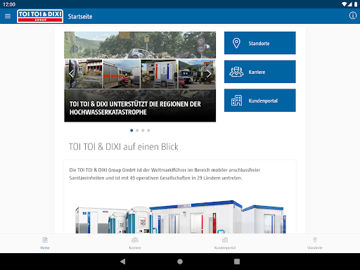 Die App TOI WE bringt News & Karriereinformationen von TOI TOI & DIXI zu Ihnen. TOI TOI & DIXI ist Weltmarktführer im Bereich mobiler anschlussfreier Sanitäreinheiten. Bekannt geworden ist das Unternehmen durch seine beiden Marken TOI TOI & DIXI. Die App TOI WE bringt nun News, Karriereinformationen, Produktneuheiten und vieles mehr direkt auf Ihr Smartphone oder Tablet. Bleiben Sie auf dem Laufenden und erhalten Sie folgende Funktionen: • NEWS: Mit TOI WE sind Sie immer über die verschiedenen News, Produktneuheiten und Services rund um das Unternehmen informiert. Referenzen erfolgreicher Projekte stellen wir an dieser Stelle ebenfalls vor. Die App kann zusätzlich für den Austausch untereinander genutzt werden. • KARRIERE & STANDORTE: Alle Informationen rund um den Karriereeinstieg bei TOI TOI & DIXI finden Sie hier, auch alle aktuell ausgeschriebenen Stellen. Zudem zeigen wir alle deutschlandweiten Standorte.