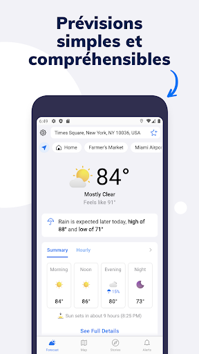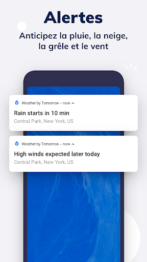 Soyez prêts et planifiez intelligemment grâce aux prévisions mondiales très précises minute par minute et rue par rue, aux alertes de pluie et de neige, aux cartes de qualité de l\air et à l\indicateur de vitesse du vent. Les prévisions uniques de demain sont exploitées par des secteurs, de l\aviation aux activités à la demande, qui ne peuvent pas se permettre de faire de mauvais choix relatifs à la météo. Vous non plus, d\ailleurs. Qu\en disent les médias ? The Washington Post - « Vous avertir quand il va pleuvoir, à la minute près, partout dans le monde. » Mashable - « Impossible d\éviter les intempéries, même à l\aide de la technologie, quels que soient nos efforts. Toutefois, la nouvelle application Tomorrow.io vous permet au moins de vous préparer. » Tomorrow\s MicroWeather - « Basée sur les données du monde connecté, les sources de données traditionnelles et une nouvelle modélisation de pointe – une appli hyper précise, spécifique et pertinente dans votre vie quotidienne. » • Prévisions à la minute près, par rue, jusqu\à trois heures à l\avance • Haute résolution : analyse météorologique à une résolution de 500 mètres • Actualisation : prévisions actualisées toutes les minutes • Restez en sécurité grâce aux alertes intempéries et aux conseils du National Weather Service. Qu\en disent nos utilisateurs ? « La meilleure application météo ! J\adore cette application météo ! Elle m\avertit lorsqu\il va pleuvoir, est dotée d\une carte radar facile à consulter sur l\écran d\accueil et est extrêmement facile à parcourir. Je préfère cette application à Accuweather, que j\utilisais depuis des années ! » - Bchan80 Bonjour #OutsmartWeather #previsionsmeteo ----- Confidentialité et commentaires - Lien vers notre politique de confidentialité : https://www.tomorrow.io/consumer-app-privacy-policy - Lien vers notre Accord de licence d\utilisateur final : https://www.tomorrow.io/consumer-app-agreement - Si vous avez des questions ou des suggestions à propos de notre service, n\hésitez pas à nous contacter à chat@tomorrow.io