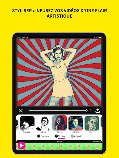 Libérez le cinéaste qui sommeille en vous avec Toonita Video : filtres Pop Art ! Élevez vos vidéos en œuvres d’art fascinantes sans effort. Cette application d\effets d\édition vidéo tout-en-un vous permet de transformer des clips ordinaires en créations extraordinaires, le tout avec une touche de filtres artistiques. Essayez la vidéo Toonita : les filtres Pop Art dès aujourd\hui! Plongez dans le monde du créateur de vidéos d\art Donnez vie à vos vidéos avec 28 effets pop art, bandes dessinées et dessins animés captivants qui ajoutent une touche enchanteresse à chaque image. Regardez vos séquences évoluer vers une toile de créativité vibrante, le tout dans l\application intuitive de filtres vidéo. Des effets d\éditeur vidéo magistral à portée de main Améliorez votre narration avec notre gamme d’effets de dessins animés. De l\attrait nostalgique des visuels de bandes dessinées au charme captivant des filtres inspirés des dessins animés, l\application de superpositions vidéo propose une vaste sélection qui transforme chaque clip en un chef-d\œuvre visuel. Votre appareil photo, vos règles Capturez des moments cinématographiques directement à partir de la caméra intégrée de l\application de filtres vidéo. Avec des aperçus de filtres en temps réel, vous pouvez voir la magie se dérouler sous vos yeux. Prenez le contrôle total de vos prises de vue et assurez-vous que votre vision artistique transparaît. Créez vos propres merveilles pop art Devenez le directeur de votre propre parcours créatif ! Le traitement en trois étapes de l\application de filtre de dessins animés – Préparer, Styliser et Ajuster – vous permet d\adapter méticuleusement vos vidéos. Affinez les paramètres du filtre lors de l\étape Ajuster pour obtenir des résultats époustouflants qui correspondent à votre style unique. Magie de l\écran vert pour des histoires fluides Changez d\arrière-plan sans effort grâce à la technique avancée d\incrustation chroma (écran vert). Transportez vos vidéos de création de vidéos de dessins animés vers n\importe quel endroit imaginable, ajoutant ainsi de la profondeur et de l\excitation à votre récit. ️ Élevez chaque image de votre film ️ Transformez de simples images en un éclat cinématographique. Qu\il s\agisse d\un court métrage ou d\un long métrage, les filtres artistiques et les effets de dessins animés feront briller chaque montage avec une touche artistique. ️ Préréglages personnalisés : votre style d\édition de signature ️ Pourquoi s\arrêter aux filtres par défaut de l\éditeur vidéo ? Toonita Video vous permet d\enregistrer vos préréglages personnalisés, vous permettant ainsi d\appliquer systématiquement votre style unique aux projets futurs. Votre créativité ne connaît pas de limites ! Partagez vos animations de dessins animés avec le monde Une fois que vous avez perfectionné votre chef-d\œuvre, partagez des animations de dessins animés avec vos amis, votre famille et vos abonnés. Regardez vos vidéos artistiques faire des vagues sur les plateformes de médias sociaux, laissant un impact durable. Avec cette application d\effets vidéo de dessins animés, chaque vidéo devient une toile, chaque image une œuvre d\art. Que vous soyez un cinéaste chevronné ou que vous commenciez tout juste votre parcours créatif, notre application de création de vidéos d\art est conçue pour améliorer votre narration avec une facilité inégalée. Embrassez le monde des filtres vidéo, transformez la réalité en votre propre dessin animé et laissez vos vidéos occuper le devant de la scène comme jamais auparavant. Téléchargez Toonita Video : Pop Art Filters maintenant et redéfinissez le montage vidéo ! Les crédits sont répertoriés sur http://toonita.app/toonita-video/.