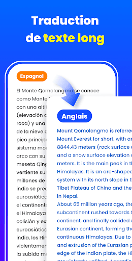 Traduire - Traducteur est un traducteur rapide et précis pour toutes les langues qui peut traduire du texte, de la voix et des photos dans plus de 150 langues ! Ce traducteur peut être votre assistant linguistique puissant en voyage, en communication avec des clients et des amis étrangers, ou en apprentissage de nouvelles langues. Que peut faire Traduire - Traducteur ? Traduction de texte - traduisez avec précision des textes dans plus de 150 langues en temps réel et gratuitement. ️ Traduction vocale - traduisez directement en utilisant l\entrée microphone, gagnant ainsi du temps et des efforts. Traduction de photos alimentée par l\IA - utilisez la caméra de votre téléphone pour reconnaître et traduire automatiquement le texte des images. Essayez maintenant ce traducteur précis pour toutes les langues et brisez les barrières linguistiques ! Pourquoi choisir Traduire - Traducteur : Traduire plus de 150 langues facilement Que vous ayez besoin d\aide pour la traduction dans le cadre de vos affaires, de vos études ou de vos voyages, laissez Traducteur vous accompagner. Traduisez toutes les langues pour surmonter les barrières linguistiques ! Détection automatique de la langue d\entrée Détecte automatiquement la langue du texte d\entrée et vous fournit une traduction précise instantanément. Profitez d\une traduction efficace et pratique à portée de main avec notre Traduire - Traducteur ! Prise en charge de la traduction hors ligne Profitez de la traduction hors ligne n\importe où et n\importe quand avec ce traducteur toutes langues. Dites adieu aux restrictions réseau et aux frais d\itinérance coûteux ! Enregistrez les traductions pour une référence rapide Créez facilement votre propre collection de traductions en marquant les textes traduits importants avec ce traducteur. Vous permet d\avoir votre propre ensemble de références linguistiques pendant les études ou les voyages ! Fonctionnalités : 150+ langues prises en charge Traduction vocale Détection automatique de la langue Copier/coller la traduction facilement Traduction inverse Lecture de la traduction pour vous Historique de traduction enregistré/supprimé Partage facile du texte traduit avec vos amis 100% gratuit Interface utilisateur simple et claire Si vous avez des questions lors de l\utilisation de l\application, contactez-nous via acetranslator.feedback@gmail.com. -------------------------------------------------------------------------- Langues que nous prenons actuellement en charge : French, English, Chinese, Indonesian, Spanish, Arabic, Russian, German, Japanese, Korean, Afrikaans, Amharic, Armenian, Assamese, Aymara, Azerbaijani, Bambara, Basque, Belarusian, Bengali, Bhojpuri, Bulgarian, Catalan, Cebuano, Chinese(Traditional), Corsican, Czech, Dhivehi, Dogri, Dutch, Esperanto, Estonian, Ewe, Finnish, Frisian, Galician, Georgian, Greek, Guarani, Gujarati, Haitian Creole, Hausa, Hawaiian, Hebrew, Hindi, Hmong, Hungarian, Icelandic, Igbo, Ilocano, Irish, Italian, Javanese, Kannada, Kazakh, Khmer, Kinyarwanda, Konkani, Krio, Kurdish, Kyrgyz, Lao, Latin, Lingala, Lithuanian, Luganda, Maithili, Malagasy, Malay, Malayalam, Maltese, Maori, Marathi, Mizo, Mongolian, Myanmar(Burmese), Nepali, Norwegian, Nyanja(Chichewa), Odia, Oromo, Pashto, Polish, Portuguese, Punjabi, Quechua, Romanian, Samoan, Sanskrit... -------------------------------------------------------------------------- - Permission requise : Caméra et Microphone. API AccessibilityService L\autorisation d\accessibilité est requise pour lire du texte n\importe où sur l\écran et fournir des traductions instantanées lors de l\utilisation d\autres applications grâce à des traductions en plein écran ou à la fonction de traduction par glisser-déposer. - Nous ne collecterons pas vos informations personnelles et respecterons entièrement notre politique de confidentialité.