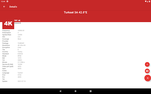 +This application does not require internet connection for a list of frequencies. +Channels; *TV And radio *SD, HD and UHD *Encrypted And FTA *Channel themes (movies, children, music) *Channel Languages *Satellite Coverage (Beam) *Satellite Package (D-Smart, Digiturk...) based filtering is done. + When clicking on the Channel, it shows the details. +Selected channels SMS, you can send applications such as WhatsApp. +It categorized according to TURKSAT (3A, 4A) satellite. Notes: Internet permission is required for ads. There are no annoying advertising.