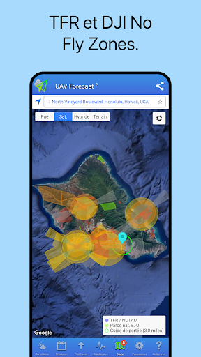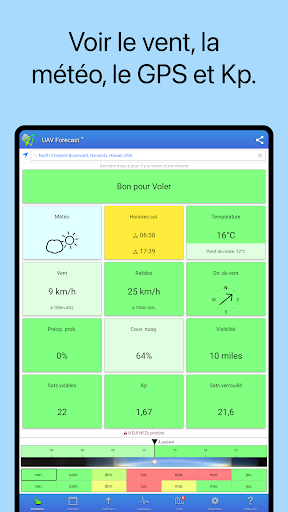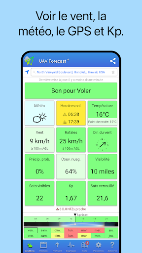 Quand sera-t-il bon de faire voler votre quadricoptère ? Consultez les prévisions météorologiques, les satellites GPS, l\activité solaire (Kp), les zones d\exclusion aérienne et les restrictions de vol, le tout dans un outil pratique. Parfait pour les drones DJI Neo, Mini, Mavic, Air, Inspire, FPV, et Hover, Autel et Skydio, ainsi que de nombreux autres véhicules et systèmes aériens sans pilote. UAV Forecast est l\outil original, le meilleur et le classique pour les pilotes de drones. Convient aussi bien aux débutants qu\aux pilotes avancés, récréatifs et commerciaux, les fonctionnalités incluent : • Données météorologiques hyperlocales, y compris les vitesses détaillées du vent et des rafales au niveau du sol et à n\importe quelle altitude. • Données satellites GPS incluant Galileo et GLONASS, indice de météo solaire (Kp), et plus encore. • Prévisions horaires jusqu\à 15 jours. • Analyse automatique des conditions avec code couleur : vert pour Bon pour Voler, rouge pour Pas Bon pour Voler. • Seuils entièrement configurables. • Thèmes clair et sombre, avec changement automatique au lever et au coucher du soleil. • Recherche de localisation et emplacements favoris. • Support complet pour tablette. Nos utilisateurs incluent également des pilotes de parapente et de paramoteur.