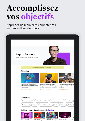 Visez la perfection pour réussir. Udemy est une plate-forme de choix pour les cours en ligne. Elle vous permet de vous développer sur les plans professionnel et personnel. Téléchargez l\application pour explorer notre vaste bibliothèque de milliers de sujets avec des cours vidéo en ligne de pointe en codage, développement, Python, Java, affaires, marketing, SEO, SEM, dessin, photographie et bien plus encore. Bénéficiez des connaissances du monde entier en apprenant auprès de formateurs confirmés. Grâce à des cours dans plus de 65 langues, vous trouverez probablement le cours qui correspond à vos objectifs. Voici ce qui rend l\apprentissage avec l\application Udemy si utile : APPRENDRE HORS LIGNE : téléchargez des cours et apprenez même lorsque votre connexion Internet n\est pas fiable. APPRENDRE SUR GRAND ÉCRAN : visionnez les cours avec Chromecast. MODE SOMBRE : restez concentré, quelles que soient les conditions d\éclairage. RAPPELS D\APPRENTISSAGE : établissez votre routine d\apprentissage avec des notifications Push personnalisées qui s\adaptent à votre emploi du temps. REMARQUES : optimisez votre apprentissage en notant vos remarques et en ajoutant des marque-pages pour mieux mémoriser ce que vous avez appris. QUIZ : répondez à des quiz intégrés aux cours pour renforcer votre apprentissage. Q&R : posez vos principales questions aux formateurs pour accroître vos connaissances ou obtenez une aide supplémentaire. ACCÈS ILLIMITÉ : suivez les cours en fonction de votre emploi du temps. Revoyez-les si besoin. De nombreux formateurs actualisent leurs cours (sans frais supplémentaires) pour vous apporter les connaissances les plus récentes dès qu\elles sont disponibles. Pour que l\apprentissage avec nous soit un investissement à court comme à long terme pour votre réussite. Autres sujets d\apprentissage populaires parmi les participants pour atteindre leurs objectifs : Développement d\applications : Android, iOS, Swift Science des données : R, Machine Learning et intelligence artificielle Marketing : mobile, réseaux sociaux, SEM, SEO Art, musique, dessin, photographie, santé et bien-être Les participants du monde entier font confiance à Udemy pour se lancer dans de nouvelles carrières, progresser dans leurs secteurs actuels et bénéficier des avantages de l\apprentissage permanent. Prenez le contrôle de votre avenir grâce à des cours en ligne qui vous permettent d\acquérir des compétences pratiques et professionnelles. Préparez-vous aux examens de certification en informatique, en gestion de projets, entre autres. Obtenez des certificats de fin de formation pour les cours payants afin de les mettre en avant sur votre CV ou de vous démarquer lors de votre prochain entretien. Rejoignez des millions de participants du monde entier et améliorez votre vie grâce à l\apprentissage !