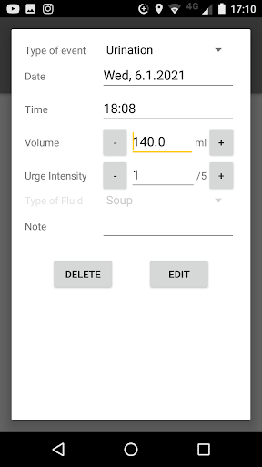 UriTrack is an app which enables you to log your urinary events (urination, leaks, urges, cathether use) as well as your fluid intake and notes. This is a replacement for a voiding log or a voiding diary that is often used in diagnostics of various urinary problems. This app allows you to check your recorded events and modify them. You can also view charts with various statistics related to your recorded data. You can also export your data and import it in another device and you can also generate a pdf file with a table of all of your events. You can select various date and time formats as well as three different measurement units: ml, oz and dcl. The developer does not collect nor does he have have access to the data you input in the app.