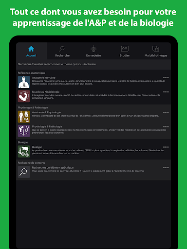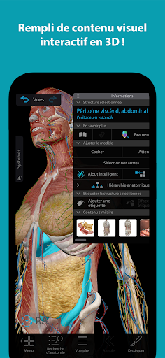 Explorez l\anatomie humaine, la physiologie et les sciences de la vie en 3D interactive grâce à Visible Body Suite ! Cet abonnement vous donne accès à l\ensemble de notre bibliothèque de contenus sur votre téléphone, votre tablette ou encore votre ordinateur. Il associe les fonctionnalités de Physiologie & Pathologie, de Muscles & Kinésiologie, de Biologie Visible, d\Anatomie & Physiologie et de l\Atlas d\anatomie humaine. Rejoignez les millions d\utilisateurs qui ont laissé de côté leur manuel de cours, leurs spécimens de laboratoire ou leurs modèles 3D en plastique et embarquez pour une expérience captivante en 3D avec Visible Body Suite ! Visible Body Suite comprend : Des modèles en 3D complets : Modèles en 3D complets et dissécables d\anatomie générale masculine et féminine, de micro-anatomie, de coupes transversales et de pathologies. Explorez l\ADN, les chromosomes, les cellules procaryotes et eucaryotes, les tissus végétaux ainsi que des modèles de vertébrés et d\invertébrés entièrement dissécables (étoile de mer, ver de terre, grenouille, cochon). Comparez l\anatomie normale à des affections courantes telles que les entorses, les calculs rénaux et l\endométriose. Apprentissage interactif et simulations : Suivez des leçons interactives sur les processus physiologiques et les pathologies. Visionnez la conduction dans un coeur en 3D dissécable qui bat, tout en effectuant le suivi d\un ECG sur lequel vous pourrez observer la fréquence cardiaque. Manipulez des dizaines d\animations portant sur les actions des muscles pour comprendre la biomécanique. Interagissez avec des simulations virtuelles de la photosynthèse, de la respiration cellulaire, de la mitose, de la méiose et de l\enroulement de l\ADN, puis étudiez-les. Des informations exhaustives : Accédez à des informations détaillées sur des milliers de structures anatomiques, notamment des définitions, des prononciations et des maladies et affections courantes, ainsi qu\à des informations approfondies sur les sites de fixation et l\innervation des muscles et les points de repère osseux. Des visuels attrayants : Disséquez des modèles d\anatomie en 3D à l\écran ou en réalité augmentée (RA). Regardez des animations 3D qui expliquent les échanges gazeux, la ventilation pulmonaire, l\équilibre des fluides, le péristaltisme, les contractions musculaires et bien plus encore. Consultez des lames d\histologie et des images diagnostiques. Outils de révision et d\évaluation : Créez et partager des flashcards en 3D. Légendez les structures avec des étiquettes, des notes et des dessins en 3D. Reliez des ensembles de modèles dans des présentations interactives en 3D pour expliquer un thème ou en réviser le contenu. Effectuez des questionnaires à choix multiples ou des tests de dissection en 3D pour évaluer vos connaissances et vous préparer aux examens. Principaux systèmes corporels couverts : Cellules et tissus, système tégumentaire, système squelettique, système musculaire, système nerveux, système endocrinien, système circulatoire, système lymphatique, système respiratoire, système digestif, système urinaire et système reproducteur. Des fonctionnalités conviviales : Commandes simples, moteur de recherche performant, accessibilité, paramètres réglables et options linguistiques multiples. Parfaite pour les professionnels de la santé, les kinésithérapeutes, les ergothérapeutes, les orthopédistes, les athlètes, les yogis, les étudiants, les médecins, les professeurs et les infirmières, Visible Body Suite rend l\apprentissage et l\enseignement de l\anatomie, de la physiologie et de la biologie visuels et attrayants. Les abonnements comprennent plusieurs mises à jour tout au long de l\année, sans frais supplémentaires !