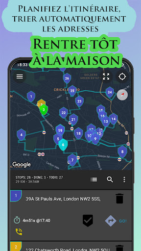 Planifiez le parcours de livraison avec de nombreux arrêts le plus rapidement possible, l\application française les commande automatiquement afin d\économiser en moyenne plus d\une heure par jour et de vous ramener chez vous plus vite que votre intuition. *** Il vous aide en triant les adresses pour vous faire gagner du temps, des Km et donc de l\argent. Version gratuite exclusivement pour la France avec le niveau gratuit le plus élevé*** VISION Planificateur d\arrêts est la seule application qui peut également extraire des adresses de tout type d\image / capture d\écran, même avec du texte manuscrit. Vous pouvez spécifier des modèles comme notes d\expédition en extrayant uniquement les adresses de livraison réelles, même à partir de plusieurs images simultanément. Tout cela est possible grâce à nos algorithmes informatiques Vision et Machine Learning qui analysent le contenu des images et insèrent les adresses trouvées directement sur la carte, en faisant éventuellement des corrections et des suggestions! Une fois la liste des arrêts à effectuer par la voix, l\autocomplétion ou les images ajoutée, VISION Planificateur d\arrêts gère tout le reste. Il décidera de la commande qui évite le trafic, vous empêche de revenir plusieurs fois dans la même zone et vous fera terminer le parcours de livraison le plus rapidement possible. Si vous tardez à planifier, optimisez à nouveau le reste de l\itinéraire pour éviter le trafic et arriver à l\heure et dans la fenêtre de livraison pour cet arrêt. Itinéraire de livraison rapide: VISION Planificateur d\arrêts crée les itinéraires de livraison à arrêts multiples les plus rapides et aide à construire des itinéraires avec des arrêts ordonnés en fonction du trafic et des moyens utilisés pour le personnel de livraison. Les conducteurs qui utilisent VISION ROUTE PLANNER rentrent chez eux plus d\une heure plus tôt que ceux qui ne le font pas et gagnent du temps, font le plein de carburant et de stress! Comment ça marche ✓ Entrez les arrêts: par la voix, le texte lu automatiquement par les images ou en utilisant le champ de recherche. Sinon, vous pouvez également maintenir un point sur la carte pour faire apparaître le marqueur. ✓ Appuyez sur Optimiser pour organiser au mieux les arrêts en fonction du trafic, des horaires et des distances. ✓ Cliquez sur chaque emplacement et sélectionnez Naviguer pour ouvrir la navigation externe. ✓ À la fin de la livraison, gardez une trace de l\arrêt visité en le cochant et en le rendant vert, afin que vous puissiez ensuite optimiser à nouveau l\itinéraire en excluant les arrêts déjà visités L\application de base est gratuite avec un nombre d\arrêts par jour limité selon les pays, mais un pack bonus quotidien pas cher ou un abonnement auto-renouvelable est désormais disponible pour ceux qui ont besoin d\un usage intensif. Vous pouvez annuler le renouvellement à tout moment sur cette page du Play Store ou dans votre application Google Play. Autres fonctionnalités intelligentes : -Parcours de livraison illimités -Ré-adressage dynamique -Ajouter et supprimer des arrêts en déplacement et avec la voix -Naviguez avec vos outils de navigation préférés comme Google Maps et Waze - Ajoutez les numéros de téléphone des clients et appelez-les / envoyez-leur un SMS directement depuis l\application - éviter les péages et les autoroutes - Inscription vocale du poste - Importer les lieux de livraison via feuille Excel - Interpréter les codes-barres / QR codes et images, extraire l\adresse et l\ajouter automatiquement à la carte - Livraisons en fonction des plages horaires - Enregistrer les dépenses et le kilométrage Prise en charge. En cas de problème avec l\application, envoyez un mail à info@routevisionplanner.com
