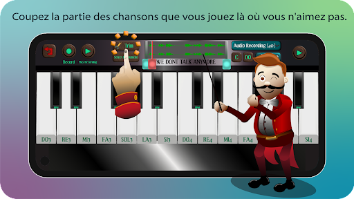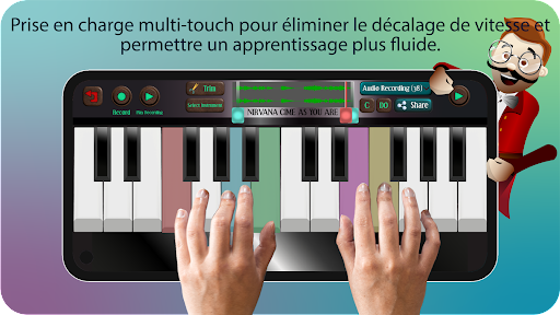 Êtes-vous à la recherche d\une application de piano virtuel qui vous évite les tracas de la lenteur vitesses? Que diriez-vous de jouer vos morceaux de musique de piano préférés sur le piano flûte à bec et vous amuser pendant votre temps libre ? Si votre réponse est oui, cet apprentissage du piano app est là pour être votre professeur de piano numérique numéro 1. L\application de musique pour piano permet vous apprenez et jouez avec vos instruments de musique préférés, de merveilleuses chansons, explorer différents sons et développer des compétences musicales. Application de maître de piano simple et facile. L\interface de l\application est colorée et lumineuse. Vous serez ravi et informé tout en apprenant la musique tout en jouant à des jeux passionnants. Cette application de piano virtuel a 450 différents sons musicaux. 4 instruments différents et 24 notes que vous pouvez jouer. Vous pouvez améliorer vos capacités musicales et composer des chansons. Véritable expérience de clavier de piano. L\application est conçue pour vous aider à devenir un joueur de piano virtuel, et finalement un pianiste et maître de piano facilement. Vous pourrez améliorer leur imagination monde en jouant du piano, de la harpe, de la guitare, du marimba et du glockenspiel. Laissez la musique coulez entre vos doigts lorsque vous appuyez sur votre écran pour apprendre le piano et le piano expérience de jeu au clavier. Caractéristiques de Real Piano Play & Learn Piano. * UI / UX d\applications de piano simples et faciles à utiliser. * 450 sons différents basés sur une véritable expérience de piano. * Prise en charge multi-touch pour éliminer le décalage de vitesse et offrir un apprentissage plus fluide. * Découvrez un son de qualité studio avec cette application de professeur de piano. * Créez vos propres mélodies ou jouez celles déjà disponibles, c\est votre choix. * Piano sophistiqué enregistré pour écouter de la musique plus tard. * Partage facile sur les réseaux sociaux. * Option de lecture en boucle. Êtes-vous prêt à utiliser l\une des applications de piano les plus cool pour Android Transform devenez un maître de piano avec cette application de professeur de piano. Laissez le piano délicat les notes dansent dans vos oreilles et enrichissent votre âme. Téléchargez et utilisez Real Piano Jouez et apprenez le piano aujourd\hui.