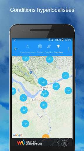 La nouvelle application Weather Underground pour Android offre les prévisions météohyperlocalisées les plus précises, et en plus, des radars interactifs, des cartes satellite et des alertes météo extrême. Optimisées par notre communauté unique de passionnés de météo qui fournissent des informations en temps réel depuis des stations météo chez eux, ces données collaboratives génèrent des prévisions ciblées destinées à votre localisation exacte. FONCTIONNALITÉS ● Notification d\état: affiche instantanément la température et les condtions actuelles ● Les conditions actuelles de ta station météo locale incluent: température, température ressentie, vitesse et direction du vent, humidité, point de rosée, visibilité ● Prévisions sur 10 jours (Par jour et par heure) + résumé ● Carte interactive montrant toutes les stations météo personnelles dans ton quartier avec des radars, des satellites animés, et plus encore. ● Vue en liste des localisations favorites et recherches récentes. ● Rapports collaboratifs ● Choix entre mode Clair ou Sombre ● Choix entre Météo sur demande et Météo du Service météo local ● Radio du Service météo national ● Section santé: Surveille la qualité de l\air, le risque UV et les épidémies locales de grippe ● Gadgets personnalisables ● Notifications push: Reste au courant des conditions météo extrêmes grâce aux alertes Météo extrême (Système d\alerte polygonal) ● Rapports Neige et Sports d\hiver ● Achète des souscriptions sans publicités pour un an à des prix raisonnables. A PROPOS DE WEATHER UNDERGROUND Fondé en 1995 comme le premier service météo en ligne, Weather Underground fournit des solutions de données météo à une grande partie des sociétés de médias les plus importantes ainsi qu\à des millions d\utilisateurs dans le monde à travers des applications mobiles et le site wunderground.com. Weather Underground fait partie de Weather Company et a son siège à San Francisco, California.
