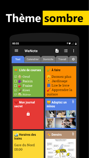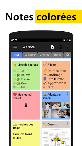 Notes simplifiées Vous recherchez un bloc-notes facile à utiliser pour une prise de notes rapide ? Besoin d\un bloc-notes pratique pour les listes de tâches et les listes de courses ? Notre application gratuite de prise de notes et notre bloc-notes offrent tout cela, sans publicité en plein écran ! WeNote : Notes, Notebook, To do est une application de prise de notes polyvalente. Créez rapidement des notes en couleur, des listes de tâches, des listes de courses, des rappels et des calendriers. Les utilisateurs adorent WeNote pour organiser leur vie, planifier leur travail ou conserver des notes d\étude. Il simplifie la prise de notes, la rendant plus simple que les autres applications de bloc-notes ou de mémos. Qu\il s\agisse de noter des mémos, des e-mails, des numéros de téléphone et des recettes, ou de tenir un journal, des listes de courses et des listes de tâches, vous trouverez WeNote exceptionnellement convivial. Donnez la priorité à votre confidentialité avec WeNote. Il fonctionne de manière transparente hors ligne, sans avoir besoin de connexion Internet ni de connexion. Assurez la sécurité de vos notes en les verrouillant à l\aide d\un code PIN, d\un schéma, d\un mot de passe ou d\une empreinte digitale, protégeant ainsi vos informations confidentielles. Comment prendre une note ? WeNote fonctionne comme un traitement de texte simple, permettant une saisie de caractères illimitée. Une fois qu\une note est enregistrée, vous pouvez l\épingler en haut, la cocher, la verrouiller avec un mot de passe, la coller à la barre de notification ou la partager et la supprimer via le menu. ️ Comment créer une liste de tâches ou une liste de courses ? En mode liste de tâches, vous pouvez ajouter un nombre illimité d\éléments de liste de contrôle. Appuyez simplement et faites glisser pour les réorganiser. Appuyez sur un élément une fois que vous l\avez terminé pour le barrer. Fonctionnalités Choisissez parmi un nombre illimité de couleurs de notes. Créez des notes colorées et des listes de tâches. Organisez des mémos avec des étiquettes et des couleurs. Glissez facilement entre les notes grâce aux étiquettes conçues sous forme d\onglets. ️ Joignez facilement des photos et des images à votre carnet. ️ Dessinez et peignez directement dans le bloc-notes. Enregistrez des mémos vocaux en mains libres avec une capacité d\enregistrement illimitée. Épinglez les notes cruciales en haut et collez-les sur la barre de notification pour un accès facile. ️ Affichez 5 widgets de notes autocollantes distincts sur votre écran d\accueil. Gardez vos notes confidentielles avec un verrou sécurisé. ️ Le todo terminé se déplace automatiquement vers le bas de votre liste de contrôle. Personnalisez vos notes avec différentes polices, modes d\affichage et options de tri. Choisissez parmi 11 thèmes de couleurs d\application vibrantes pour un attrait esthétique. Définissez des rappels et affichez un calendrier, avec une phase lunaire. Ne manquez jamais un mémo grâce à des rappels personnalisables et répétables. Accédez à un calendrier des jours fériés mondial prenant en charge 250 pays et 3 680 régions. ️ Synchronisez en toute sécurité avec WeNote Cloud ou Google Drive, garantissant ainsi aucune perte de notes. ️ Sauvegardez et restaurez localement pour une sécurité accrue des notes. Partagez des notes par e-mail, SMS et diverses applications de messagerie. La fonctionnalité Annuler/Rétablir garantit une prise de notes sans erreur. Convertissez automatiquement les URL et les numéros de téléphone en liens cliquables. ️ Envoyez des notes directement à une imprimante ou exportez-les au format PDF. Recherchez instantanément dans les notes et les listes de tâches. Divers widgets d\accueil pour un accès rapide Il existe 5 widgets : notes autocollantes, mini notes autocollantes, ajout rapide, calendrier et liste de notes.