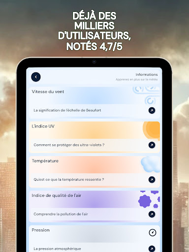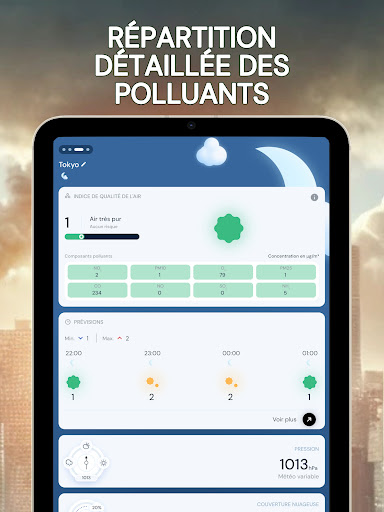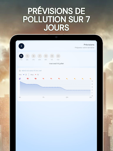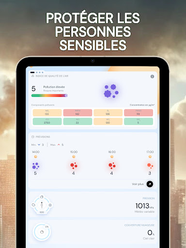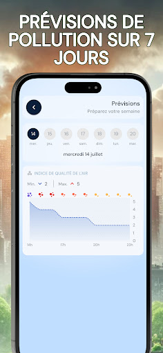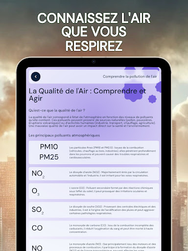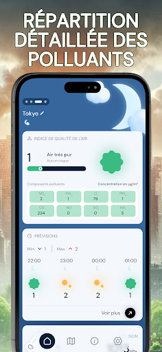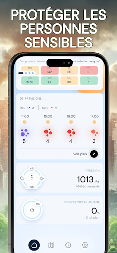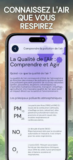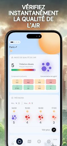 Renseignez-vous sur la qualité de l’air que vous respirez avec l\indice de pollution de l\air. Grâce à notre application, obtenez en temps réel tous les renseignements nécessaires sur la qualité de l’air extérieur, peu importe l’endroit où vous vous trouvez, de manière pratique et rapide. En quelques clics, commencez par utiliser la géolocalisation ou choisir un lieu pour des informations précises. Puis, obtenez un taux de pollution de l’air fiable grâce à notre indice de mesure, allant de très satisfaisant à dangereux pour la santé. Vous trouverez avec cette mesure, les conséquences pour votre santé ainsi que les mises en garde, permettant aux personnes sensibles (asthme ou autres maladies respiratoires) et aux autres de rester vigilant en évitant au maximum de s’exposer à la pollution. Pour les plus aguerris, il sera également possible de trouver le détail des composants polluants principaux et secondaires, selon le taux de pollution donné, afin de permettre une information complète. Vous voulez prévoir une sortie dans la journée ? Utilisez nos prévisions allant jusqu’à 5 jours pour anticiper les épisodes de forte pollution et sortir au meilleur moment. Pour vous préparer au mieux pour votre journée à l’extérieur, vous aurez également à votre disposition un point météo matinal journalier. Préservez votre santé avec air pollution index. N\hésitez pas à noter l’application si vous l’aimez !