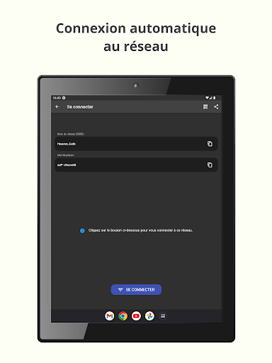 WiFi QR Connect vous permet de vous connecter à un réseau Wi-Fi en scannant un code QR. Il vous suffit d\ouvrir l\application et de pointer la caméra arrière de votre appareil sur le code de votre choix. L\application le scannera et vous permettra de vous connecter à ce réseau sans avoir à saisir de données manuellement. Caractéristiques : - Connexion automatique aux réseaux Wi-Fi en scannant les codes QR. - Vous pouvez également numériser un fichier image contenant un code à partir de votre appareil. - Récupération rapide de tous les codes scannés dans la section Historique. - Possibilité d\afficher le mot de passe du réseau > Où peut-on trouver des codes QR ? Vous pouvez trouver des codes QR contenant des informations sur le réseau Wi-Fi à différents endroits, par exemple sur le dessous des routeurs (pour pouvoir se connecter au réseau qu\ils fournissent) ou dans des lieux publics tels que des cafés ou des restaurants où les propriétaires ont imprimé ces codes pour que les clients puissent facilement se connecter au réseau que ces lieux fournissent. > Est-il possible de générer moi-même ces codes afin que les invités puissent se connecter à mon réseau domestique ? Oui, vous pouvez utiliser un outil de génération de codes pour créer ces codes. Vous pouvez ensuite les imprimer ou simplement les montrer à vos invités directement depuis votre téléphone pour qu\ils se connectent. Un exemple d\outil de génération en ligne est QiFi : https://qifi.org/ > Comment utiliser cette application ? Une fois que vous avez ouvert l\application, le scanner de codes utilisant l\appareil photo de votre appareil sera automatiquement activé. Cadrez le code à scanner et l\application le détectera automatiquement. Vous pouvez également choisir un fichier image contenant un code QR dans votre système de fichiers local. Une fois le code scanné, vous obtiendrez des informations le concernant, ainsi que la possibilité de vous connecter automatiquement. Appuyez sur le bouton de connexion et l\application tentera automatiquement de se connecter au réseau fourni. Veuillez noter que pour que la connexion soit établie avec succès, le réseau doit être disponible, votre appareil doit être à portée et les données fournies dans le code doivent être correctes. > Que peut faire d\autre cette application ? En plus de ce qui précède, cette application vous permet également de récupérer tout code que vous avez scanné précédemment. Vous pourrez voir vos données comme si vous veniez de les scanner. En outre, vous disposez de plusieurs options supplémentaires telles que le partage du code ou l\affichage du mot de passe du réseau. --- En résumé, WiFi QR Connect est l\outil idéal pour se connecter facilement et rapidement aux réseaux Wi-Fi en scannant un code QR. Il a été conçu dans un souci de simplicité afin de le rendre facile et naturel à utiliser - téléchargez-le maintenant et simplifiez la façon dont vous vous connectez aux réseaux sans fil !