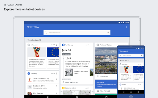 Welcome to Wikipedia Beta for Android! You can install Wikipedia Beta alongside your current version of Wikipedia for Android, so you can test our new features before they go live for all Wikipedia for Android users. Your feedback will help us fix bugs and decide what features to focus on next. Please help us improve this app by leaving feedback here or sending a note to our mailing list, mobile-android-wikipedia@wikimedia.org. Features: Explore feed: Recommended and constantly-updating Wikipedia content right on the home screen, including current events, trending articles, events on this day in history, suggested reading, and more. The feed is fully customizable — you can select the types of content you want to see, or rearrange the order in which different types of content appear. Color themes: With a choice of Light, Dark, and Black themes, as well as text size adjustment, you can customize the app for the most comfortable reading experience. Voice-integrated search: Easily find what you’re looking for with a prominent search bar at the top of the app, including voice-enabled search on your device. Language support: Seamlessly switch to reading any language-supported Wikipedia, either by changing the language of the current article, or changing your preferred search language while searching. Link previews: Tap on an article to preview it, without losing your place in what you’re currently reading. Press and hold a link to open it in a new tab, allowing you to keep reading the current article without losing your place, and switch to the new tab when you\re ready. Table of contents: swipe left on any article to bring up the table of contents, which lets you jump to article sections easily. Reading lists: Organize the articles you browse into reading lists, which you can access even when you\re offline. Create as many lists as you like, give them custom names and descriptions, and populate them with articles from any language wiki. Syncing: Enable synchronizing reading lists to your Wikipedia account. Image gallery: Tap on an image to view the image full-screen in high resolution, with options to swipe for browsing additional images. Definitions from Wiktionary: Tap-and-hold to highlight a word, then tap the \Define\ button to see a definition of the word from Wiktionary. Places: See Wikipedia articles as markers on a map, whether it\s around your location, or any place in the world. Send us your feedback about the app! In the menu, press \Settings\, then, in the \About\ section, tap \Send app feedback\. The code is 100% open source. If you have experience with Java and the Android SDK, then we look forward to your contributions! https://github.com/wikimedia/apps-android-wikipedia Explanation of permissions needed by the app: https://www.mediawiki.org/wiki/Wikimedia_Apps/Android_FAQ#Security_and_Permissions Privacy policy: https://m.wikimediafoundation.org/wiki/Privacy_policy Terms of Use: https://m.wikimediafoundation.org/wiki/Terms_of_Use About the Wikimedia Foundation The Wikimedia Foundation is the nonprofit organization that supports Wikipedia and the other Wikimedia projects. The Wikimedia Foundation is a charitable organization funded mainly through donations. For more information, please visit our website: https://wikimediafoundation.org/wiki/Home.