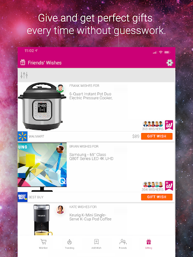 Wishfinity makes gifting effortless for every occasion, from birthdays and Valentine\s Day to Christmas and \just because\ moments. Create a universal wishlist to collect all your gift ideas in one place, share them with friends and family, or keep them private for your eyes only. With Wishfinity, you’ll never waste time managing multiple lists again. Why choose Wishfinity? • Master Birthday Gifting: Own the birthday wishlist space and track your gifts with ease. • Perfect for Valentine\s Day: Create romantic gift ideas and share a wishlist with your Valentine. • Universal Wishlist Maker: Add items from any store into a single gift list for convenient shopping. • Private and Anonymous Options: Receive gifts securely without sharing your address. • Cash Gifts Made Simple: Link PayPal, Venmo, or Cash App to collect cash contributions easily. • Track Gifts for Every Occasion: Manage gifts for weddings, anniversaries, holidays, and more with an intuitive gift tracker. Discover the Best Features: • Build a wishlist for any occasion—birthday, wedding, baby shower, holiday, or \just because.\ • Use Wishfinity as your personal wishlist maker to combine items from all your favorite stores. • Keep wishes private or share them with friends, family, or fans for collaborative gifting. • Simplify your shopping experience with a versatile wish list app designed to meet all your needs. Perfect for All Gift-Giving Needs: Whether you\re looking for things to get me, planning a surprise for loved ones, or creating a wishlist for your wedding registry, Wishfinity is your ultimate companion. It works seamlessly for any event: • Birthdays and anniversaries • Valentine\s Day gifting • Weddings and baby showers • Housewarmings and holiday celebrations • Graduation gifts, Secret Santa, and more! Create and Share Effortlessly: With Wishfinity, you can: • Find and collect items from thousands of stores, curating your perfect wishlist or gift registry. • Share your wish list instantly via text, email, or social platforms like X, Instagram, WhatsApp, and TikTok. • Organize your list into categories for easy shopping. Why Fans Love Wishfinity: • It’s giftable for everyone: create lists for friends, family, coworkers, or fans. • Acts like a gift tracker, keeping tabs on what’s been purchased. • Whether you\re a giftbuster looking for last-minute presents, a GoWish enthusiast organizing special moments, or a wishlist maker planning ahead, Wishfinity has you covered. • Receive gifts anonymously or privately with secure delivery options. • Ideal for content creators who want to share curated wishlists with followers. Clever Uses for Wishfinity: • Use it as your locker of favorite gift ideas for the future. • Plan holiday surprises with the best wish-list app available. • Collaborate with family using shared gift lists for events like weddings or reunions. • Create fun lists like “things to get me” or explore giftful ideas for any occasion. How Wishfinity Stands Out: • Integrates beautifully with cash gift options for ultimate flexibility. • Combines the practicality of a gift list with the joy of giving. • Works like a my registry tool but lets you include items from everywhere, not just one store. • Keeps gifting simple, even for Secret Santa events or elfster-inspired holiday fun. • Offers a truly gifted experience, making every moment feel meaningful. Get Started Today! Wishfinity transforms gifting into a seamless experience, whether you\re creating a wishlist, managing a gift registry, or planning your next big surprise. It’s a versatile giftlist tool that helps you stay organized and makes every gift meaningful. Download Wishfinity now and simplify your gift-giving journey. It’s the ultimate wishlist app for birthdays, Valentine\s Day, weddings, and everything in between. Whether you’re looking to track gifts, share lists, or create private wishlists, Wishfinity is here to make every occasion unforgettable.
