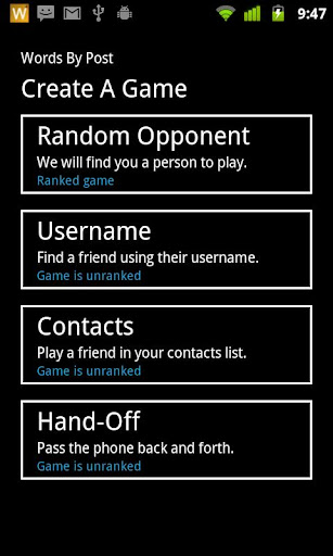 Now available for iPhones too! Tell your friends! Words By Post is the only cross-platform word game that keeps track of your skill level and always matches you against players of similar ability to your own. And since it is available for iPhone, Android, and Windows Phones, you can play your friends no matter what type of phone they have! Play this classic multiplayer word game with real people online! Challenge your friends to friendly games or play ranked matches against random opponents of similar skill levels. Compete for the highest rating. Play as many simultaneous games as you want! If you like competitive word games like Scrabble, you will love Words By Post. Automatic push notifications will let you know when you have moves waiting! Chat with your opponents using the in-game message board. Improve your ranking by playing ranked games against comparable opponents. Skill ranking updates using the classic Elo rating system to adjust your rank when you win or lose. A leaderboard view shows you how you compare to the top players. Words By Post is perfect for players of all skill levels because your matched opponent\s skill level will be adapted based on your own skill level. Create a local hand-off game and play your friend by passing the phone back and forth. When you make your move, your opponents tiles will not be visible until they reveal them. Tap on your opponent\s name to see your all-time head-to-head stats against that player. Words By Post is available for iPhone, Android, and Windows Phones.