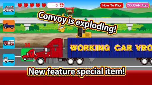 Es ist eine Anwendung, um die einzigartigen Bewegungen jedes funktionierenden Autos zu sehen und zu spielen. Es gibt verschiedene Gimmicks, die einfach zu bedienen sind, indem Sie einfach auf die Symbole und verschiedene Dinge tippen, die erscheinen. Arbeitsfahrzeuge wie Schaufelbagger, Muldenkipper, Mischfahrzeuge, Bulldozer, Radlader, Hubarbeitsbühnen, Pumpenfahrzeuge, Müllfahrzeuge, Lastwagen, Containerlastwagen usw. Verschiedene Autos wie Busse und leichte Lastwagen werden erscheinen. Tippen Sie auf das Symbol, um den Typ des Autos zu ändern, das in der Mitte des Bildschirms fährt. Wenn Sie auf das Fahrzeug tippen, können Sie die dem Fahrzeug eigene Aktion sehen. Darüber hinaus werden verschiedene Arten von Autos als Autos angezeigt, die aneinander vorbeifahren, sodass Sie durch Antippen etwas sehen können. Gelegentlich können Dinosaurier und UFOs auftauchen, also tippen Sie bitte darauf. Auch Züge wie der Shinkansen werden dahinter auftauchen. Über Sonderposten Sie können spezielle Gegenstände verwenden, indem Sie 5 Herzen verbrauchen. Es gibt 4 Arten von Sonderposten. Wenn Sie es verwenden, können Sie die Schaltfläche für einen bestimmten Zeitraum verwenden. 1. „Convoy Trailer Button“ Ein riesiger Konvoi erscheint. 2. „F1-Maschinen-Schaltfläche“ Viele F1-Maschinen werden angezeigt 3. „Big Button“ Das Arbeitsauto wird in zwei Stufen riesig. 4. „Schaltfläche Großer Muldenkipper“ Ein großer Muldenkipper erscheint. Tippen Sie auf, um die Erde von der Ladeplattform abzulassen.