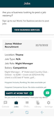 Join WorkL. Find your perfect job from the millions listed and linked to millions of employee reviews plus build your network, knowledge and develop your career with tailored resources. Our Messenger App is designed for all of your working needs. You can build a directory of business contacts: suppliers, customers and colleagues. Create project groups and share information with ease. Using our app means you\re always in touch, no matter where you are. Convos Keep up and catch up with colleagues, set up a project call or get in touch with your team to stay connected. Jobs Browse and apply for the right job at the best places to work with a click of a button. Global Hub Share your thoughts and ideas, ask for career help and advice and build your network. Library Learn and grow everyday with thousands of podcasts, videos, articles, research and books, tailored for you.