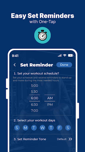 Rappel de remise en forme - Votre compagnon d\entraînement ultime : Êtes-vous à la recherche d’un outil polyvalent pour améliorer votre parcours de remise en forme ? Ne cherchez pas plus loin que Workout Fitness Reminder – une application puissante qui combine une minuterie d’entraînement, un réveil et une minuterie dans un seul package pratique. Avec un ensemble de fonctionnalités robustes et une conception intuitive, c\est le compagnon idéal pour les athlètes, les amateurs de fitness et toute personne engagée dans un mode de vie plus sain. Suivez vos entraînements avec précision : Le rappel de remise en forme est conçu pour vous aider à maximiser vos séances d\entraînement en gardant une trace de vos entraînements avec précision. Que vous pratiquiez l\entraînement par intervalles à haute intensité (HIIT), le yoga, le cardio, l\haltérophilie ou toute autre forme d\exercice, cette application est là pour vous. Définissez des intervalles personnalisés, des comptes à rebours et des périodes de repos pour optimiser vos routines et faire passer vos performances au niveau supérieur. Personnalisez votre expérience de formation : L\une des fonctionnalités les plus remarquables de Workout Fitness Reminder est sa capacité à personnaliser votre expérience d\entraînement. Adaptez vos entraînements en fonction de vos objectifs et préférences spécifiques. Ajustez la durée de chaque intervalle, définissez différentes tonalités d\alerte pour différentes phases et personnalisez même les couleurs d\affichage pour créer une expérience visuelle adaptée à votre style. Avec ce niveau de personnalisation, vous pouvez vraiment vous approprier vos entraînements. Ne manquez jamais un battement avec le réveil : Nous comprenons l’importance de commencer votre journée du bon pied. C\est pourquoi le rappel d\entraînement physique comprend un réveil intégré pour vous aider à vous lever et à briller, prêt à atteindre vos objectifs de remise en forme. Définissez l\heure de réveil souhaitée, choisissez parmi une gamme de sons d\alarme et réveillez-vous rafraîchi et motivé chaque matin. Cette fonctionnalité garantit que vous établissez une routine cohérente et restez discipliné dans votre parcours de remise en forme. Restez discipliné avec des minuteries et des rappels : La cohérence est essentielle lorsqu’il s’agit d’atteindre les objectifs de remise en forme. Le rappel de remise en forme d\entraînement est équipé de minuteries et de rappels qui vous permettront de rester sur la bonne voie, vous assurant de ne jamais manquer une séance d\entraînement ou une tâche importante liée à votre routine de remise en forme. Définissez des rappels pour boire de l’eau, prendre des suppléments ou participer à toute activité favorisant votre bien-être général. Ces doux coups de pouce vous aideront à maintenir la discipline et à progresser vers vos objectifs. Vidéos de répétition : apprenez des pros : Pour améliorer encore votre expérience d\entraînement, le rappel de remise en forme donne accès à une bibliothèque complète de vidéos de répétition. Ces vidéos présentent des entraîneurs et des athlètes experts présentant des variations de forme, de technique et d\exercices appropriées dans diverses disciplines. Que vous soyez débutant ou passionné de fitness avancé, ces vidéos constitueront des ressources précieuses pour affiner vos compétences et prévenir les blessures. Améliorez vos connaissances, élargissez votre répertoire d\exercices et améliorez votre niveau de fitness grâce à cette richesse de contenu pédagogique. En conclusion, Workout Fitness Reminder est un outil complet qui combine une minuterie d\entraînement, un réveil et une minuterie en une seule application exceptionnelle. Il vous permet de suivre vos entraînements, de personnaliser vos séances d\entraînement, de rester discipliné et d\accéder à de précieuses vidéos de répétition. Tirez le meilleur parti de votre parcours de remise en forme en exploitant la puissance de cette solution tout-en-un.