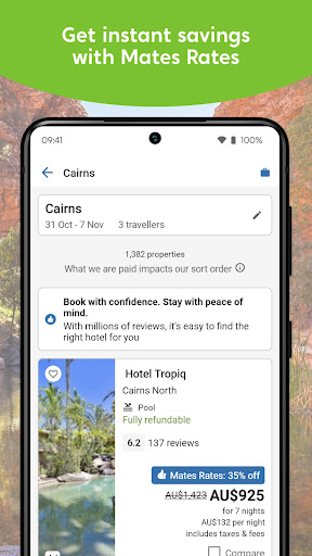 Save up to 30% with mobile-exclusive deals! Book and manage your trips 24/7. The Wotif app brings the Home of Holidays to your fingertips. Explore thousands of mobile-exclusive deals that can save you up to 30% on your holiday. Book on the go and manage your trips and hotel anywhere, any time. STAY • Get access to hotel deals only available on the free Wotif app • Search millions of hotel rooms in thousands of destinations around the world • Find accommodation across Australia and New Zealand, whether your dream holiday is in Sydney, Melbourne, Gold Coast, Bali, Fiji or in the heritage lanes of London and New York • Find the perfect accommodation for a winter holiday or an exotic romantic getaway • View hotel search results on an interactive map plus find hotels near your current location • Log in and save your details to make your next hotel booking even faster FLY • Booking return or one-way flights to thousands of destinations around the world is new easier than ever • Hundreds of airlines to choose from including low cost carriers • Fly to the sun-baked beaches of Hawaii, Indonesia, Thailand and China or book flights for the perfect winter trip to Auckland, Rotorua or the ski slopes of New Zealand • Sort flight options by price, time or duration • Compare prices across Virgin Australia, Qantas and low cost carriers including Tigerair and Jetstar CAR RENTALS • Choose from economy to luxury cars for that perfect weekend getaway • Discover pickup locations near you or pickup your car hire when you arrive at the airport • Only available on phone ACTIVITIES • Discover events, tours, festivals, shows and hundreds of activities around the world. Wedding in Vegas anyone? Or maybe just a transfer to your hotel from the airport • Book the Sydney Opera House tour or the Melbourne Attractions Flexi pass among more adventurous getaways across Australia and New Zealand • Only available on phone MANAGE YOUR TRIP • Travel like a pro. View all of your Wotif hotel booking, while you’re on the go • Don’t get caught out. Mobile alerts about flight delays, hotel check out times and more • And don’t forget to brag about it: Share your hotel itinerary with family and friends via email or text message *Some hotels require you to cancel at least 24-48 hours before check-in. See site for details. APP10 coupon code Terms & Conditions Subject to the restrictions set out in these terms and conditions, the 10% promotion codes may be applied to a qualifying stand-alone hotel (not a hotel booking in combination with any other product such as flight + hotel, or flight + hotel + car) booked on a mobile device or the Wotif app by 31 March 2023 for 1 or more nights for travel by 30 September 2023. Qualifying bookings instantly receive 10% off at check-out through the use of the promotion code. Customers are limited to one redemption of this promotion code and up to a maximum savings of 150 AUD per booking. After this one booking, the promo code will not be able to be used again, even if the booking is cancelled. Exclusions may apply and most major hotel chains are excluded. The promotion code cannot be redeemed against taxes, supplier fees, cancellation or change fees/penalties, administrative fees or other miscellaneous charges, which are the sole responsibility of the customer. Discounts are not redeemable for cash for any reason. Promotion codes are non-transferable, not for resale, and cannot be combined with other offers or used for any booking previously made. Any attempt at fraud will be prosecuted to the fullest extent of the law. Void where prohibited, taxed or restricted by law. Wotif reserves the right to change or limit the promotion in its sole discretion. Usual booking terms and conditions apply (see https://www.wotif.com/p/info-other/legal.htm) and all bookings are subject to availability. The Wotif app uses information for analytics, personalisation and advertising. By using our app, you agree to our privacy and cookies policies.