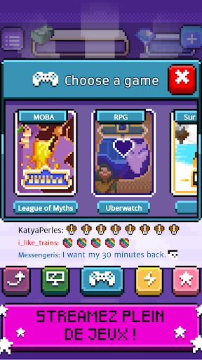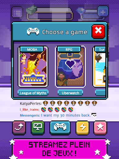 Ne vous contentez pas de regarder les chaînes de livestream : créez les vôtres ! Créez des vidéos drôles et passionnantes et réunissez une communauté de fans ! Ensuite, faites des streams de je, accumulez plus de vues et commencez à gagner plein de fric ! Qui a dit qu’il est impossible de devenir riche en jouant à des jeux toute la journée ? CE QUI VOUS ATTEND STREAMEZ des jeux en direct sur votre propre chaîne et obtenez des fans ! Faites vibrer vos abonnés avec de l\adrénaline grâce vos prouesses ! OBTENEZ de plus en plus de vues et portez une attention particulière aux discussions de vos abonnés pour leur donner exactement ce qu\ils veulent et commencer à faire de l\argent ! AMÉLIOREZ votre configuration pour faire de meilleurs flux et augmentez vos abonnés ! Choisissez parmi les quatre genres de jeux à diffuser: MOBA, FPS, RPG et Survival! Mesurez le taux d\approbation de chacun parmi vos abonnés pour maximiser votre impact ! ACCOMPLISSEZ chaque objectif de Stream et devenez le livestreamer le plus célèbre sur Stream.tv ! Mettez toutes vos années de gaming à bon escient et montrez au monde à quel point vous êtes bon dans de nombreux types de jeux (cliqueurs inclus) ! Une fois que vous démarrez votre chaîne de streaming, il n\y a pas de retour en arrière: vos fans cliqueront toujours pour votre prochaine diffusion, sauf s’ils sont déçus ! Utilisez tout l\argent que vous gagnez pour vous équiper d\un équipement d’élite, écoutez vos abonnés et vous passerez rapidement à travers les rangs livestreamer et deviendrez la star incontournable de Stream.tv !