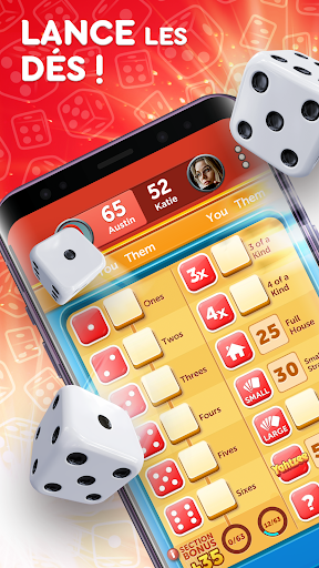 Lancez les dés pour jouer à YAHTZEE With Buddies ! Le jeu de société classique arbore un nouveau look. Jouez aux dés avec vos amis dans ce jeu pour deux. Défiez vos amis dans ce jeu familial pour vous amuser pendant des heures ! Le jeux de dés classique est réinventé dans YAHTZEE With Buddies ! Vous aimez les jeux de réflexion ? Le poker d\as ? La stratégie ? Alors vous allez adorer ce nouveau jeu de dés, à jouer en solo ou en multijoueur ! Vous ne savez pas ce qu\est YAHTZEE ? Téléchargez le jeu dès maintenant pour le découvrir ! Un jeu de société classique et amusant à emporter partout Jouez au meilleur des jeux de dés, sous licence officielle de Hasbro, où vous voulez et quand vous voulez. Un jeu de dés social : lancez les dés pour disputer des parties épiques à deux joueurs. Jouez aux dés avec votre famille et vos amis. Vous pouvez discuter et envoyer des autocollants en jouant ! Rejoignez une famille YAHTZEE pour jouer les uns contre les autres et vous faire aider par vos amis ! ===Caractéristiques de YAHTZEE With Buddies=== Gagnez des bonus exceptionnels : • Terminez des parties pour remporter des lancers bonus, des entrées gratuites et de nombreuses autres récompenses. • En cas de besoin, utilisez un lancer bonus et profitez d\une seconde chance ! Défiez les Maîtres des dés : • Affrontez les Maîtres des dés dans la version réinventée de l\aventure solo de Yahtzee. Battez les Maîtres des dés et obtenez des dés personnalisés en cours de route ! • Venez à bout de dizaines de nouveaux niveaux avec des bonus et obstacles exclusifs comme les blocs de glace, les multiplicateurs volants et bien plus encore ! • Participez à la Course pour découvrir la compétition ultime en face à face ! Participez aux tournois : • Un nouveau défi passionnant vous attend : les tournois de dés ! Redécouvrez le jeu avec les variantes Yahtzee Solitaire, Yahtzee Bingo et Yahtzee Stars ! • Progressez dans les différentes ligues pour remporter des prix exceptionnels ! Jeux sociaux à découvrir entre amis • Jouez avec votre famille et vos amis. Créez votre propre famille en jeu pour jouer les uns contre les autres et vous entraider. • Jouez en multijoueur avec des adversaires choisis au hasard. Faites des parties de dés avec des joueurs du monde entier. • Explorez Yahtzee Survivor pour jouer les uns contre les autres en temps réel avec des centaines de participants, et décrochez la plus belle récompense Yahtzee. • Discutez avec vos amis et défiez-les grâce à nos nouvelles fonctionnalités sociales ! Personnalisez votre expérience de jeu : • DES TAS DE DÉS PERSONNALISÉS ! • DES TAS DE CADRES SPÉCIAUX POUR VOTRE PORTRAIT ! • DES TAS DE PLATEAUX DE JEU THÉMATIQUES ! Crag, balut, farkle, kismet, yamb ou generala... Il n\y a qu\un seul véritable Yahtzee ! Lancez les dés pour découvrir pourquoi des millions de personnes jouent à ce jeu familial classique depuis plus de 50 ans ! Téléchargez l\application, lancez les dés et préparez-vous à crier « YAHTZEE » ! Les noms et logos HASBRO et YAHTZEE sont des marques déposées de Hasbro. 2020 Hasbro, Pawtucket, RI 02861-1059 USA. Tous droits réservés. TM & indiquent les marques déposées aux États-Unis. Politique de confidentialité : https://scopely.com/privacy/