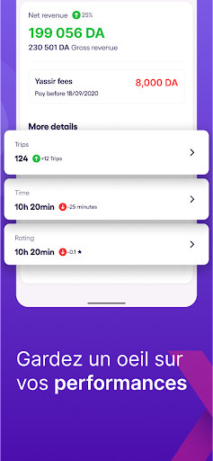 Rejoignez l\équipe des chauffeurs Yassir – l\application leader du transport à la demande Augmentez vos revenus et contrôlez vos horaires de travail en transportant nos clients vers leurs déplacements quotidiens. Pourquoi devenir un chauffeur Yassir ? • Votre première semaine sans commission (selon votre pays). • Les courses sont disponibles à tout moment et les profits sont garantis. • Vous bénéficiez d\une réduction sur votre assurance auto avec notre partneraire (selon votre pays). • Des offres spéciales et des surprises vous attendent en tant que chauffeur avec Yassir. Qu\est-ce qui distingue l\application Yassir Chauffeur ? • Vous pouvez confirmer votre disponibilité à l\aide d\un bouton. • Vous pouvez utiliser votre application cartographique préférée pendant que vous conduisez. • Vous pouvez accéder à tous vos courses et à l\historique de vos revenus. • Vous pouvez payer votre commission mensuelle directement via l\application en utilisant des cartes de paiement locales. • Vous pouvez suivre vos performances via la section analytique. Comment rejoindre l\équipe de chauffeurs de Yassir ? • Inscrivez-vous sur chauffeur.yassir.com. • Téléchargez l\application Yassir Chauffeur pour finaliser votre inscription • Complétez la formation. • Acceptez la première course pour commencer votre aventure avec Yassir ! Vous avez une question ou besoin d\aide ? • Vous pouvez contacter le service client 24h/24 et 7j/7. Vous pouvez également communiquer avec nous via les réseaux sociaux. Le service de transport à la demande Yassir est disponible 24h/24 et 7j/7 dans de nombreuses villes d\Algérie, de Tunisie, du Maroc et du Sénégal. Visitez le site yassir.com pour voir la liste des pays où nos services sont opérationnels. Téléchargez dès aujourd\hui l\application Yassir Chauffeur et réalisez vos ambitions avec nous ou en visitant chauffeur.yassir.com