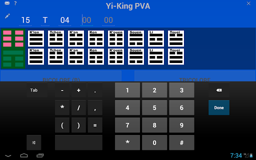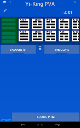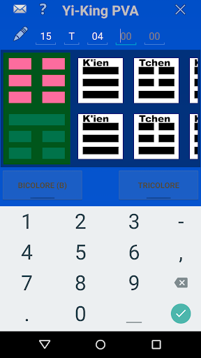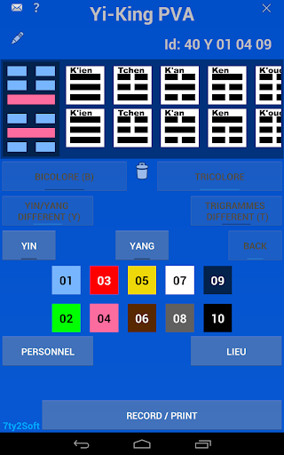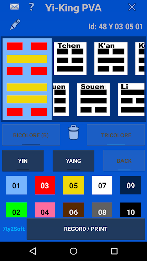Bioénergie: Un Yi-King est un Symbole hexagramme (六十四卦 liùshísì guà) constitué de trait YIN et de trait YANG. Ils sont utilisés dans plusieurs domaines et notamment dans la Bioénergie. Dans la Bioénergie, il ont un rôle de protection contre les agressions virtuelles dans un Lieu ou sur une Personne. Ils sont au nombre de soixante-quatre et résultent de la combinaison de deux trigrammes. Un trigramme supérieur et un trigramme inférieur. Avec cette application, vous pourrez construire un Yi-King bicolore ou tricolore. Si vous choisissez un Yi-King tricolore, il peut être Yin/Yang différents ou Trigrammes différents. Déterminez le Yi-King qu\il vous faut et imprimez le ou enregistrez le en Pdf.