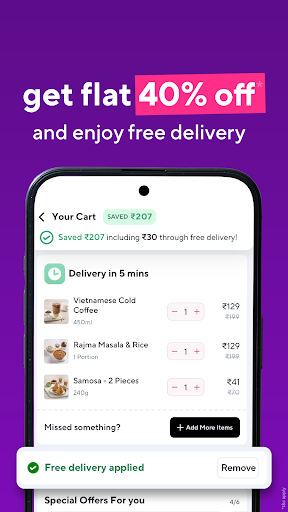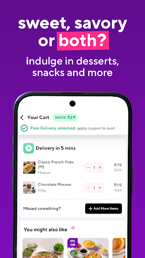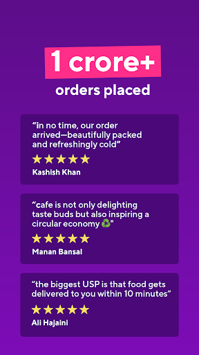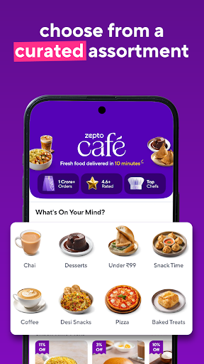 Introducing Zepto Cafe: Your 10-Minute Fresh Food Delivery App Craving delicious, fresh food but short on time? Zepto Cafe is here to revolutionise your dining experience! Get a wide variety of mouthwatering dishes and refreshing beverages delivered to your doorstep in just 10 minutes*. ## Lightning-Fast Delivery Experience the convenience of having your favourite meals at your fingertips. From crispy samosas to aromatic chai, and our signature Vietnamese cold coffee, Zepto Cafe offers an extensive menu to satisfy every craving. ## Unbeatable Variety Explore our diverse selection: - Quick Bites: Chicken Puff, Veg Tandoori Momos, Garlic Bread with Cheese Dip - Comfort Food: Plain Maggi, Poha, Rawa Upma, Chole Kulche - Hearty Meals: Hyderabadi Chicken Biryani, Butter Chicken & Rice, Paneer Makhani & Naan - Beverages: Masala Chai, Spanish Coffee, Hazelnut Cold Coffee, Peach Iced Tea - Desserts: Chocolate Mousse, Tiramisu, Layered Double Chocolate Cake Jar Plus, find all your grocery needs right here in the Zepto Cafe app! ## Exclusive Offers We\re here to make you feel special: Enjoy up to 40% off on your first cafe order. ## Why Choose Zepto Cafe? - Top-Quality Assurance: Orders prepared by expert chefs - Trusted Service: Over 1 crore orders delivered with a 4.6+ rating - User-Friendly Interface: Easy ordering process with live tracking - Secure Payments: Multiple options including UPI, cards, and cash on delivery Experience the convenience of Zepto Cafe today! Download now and transform the way you enjoy fresh, delicious food. *T&C apply. Check the ETA before placing your order.